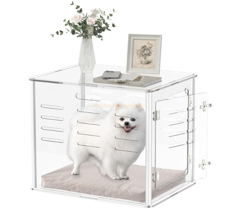 Enhance your product lineup with our custom acrylic end table dog crate, a stylish fusion of furniture and pet comfort. This multifunctional piece serves as both a sleek end table and a secure, transparent dog crate—perfect for modern interiors. Crafted from durable acrylic, it offers visibility and ventilation without compromising style. Available wholesale only, it's ideal for premium pet retailers. Enjoy duties-covered, door-to-door delivery, ensuring a smooth, cost-effective experience from our warehouse directly to you.
