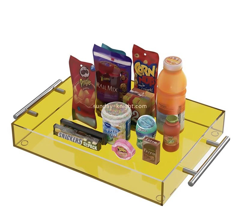 Custom translucent yellow acrylic serving tray with metal handles — elegant, sturdy, and easy to carry. Made from high-quality acrylic with a bright translucent finish and smooth edges, paired with durable metal handles for a modern look. Ideal for serving drinks, desserts, or snacks at home or in cafés. Fully customizable in size and style. Door-to-door delivery, tax paid.